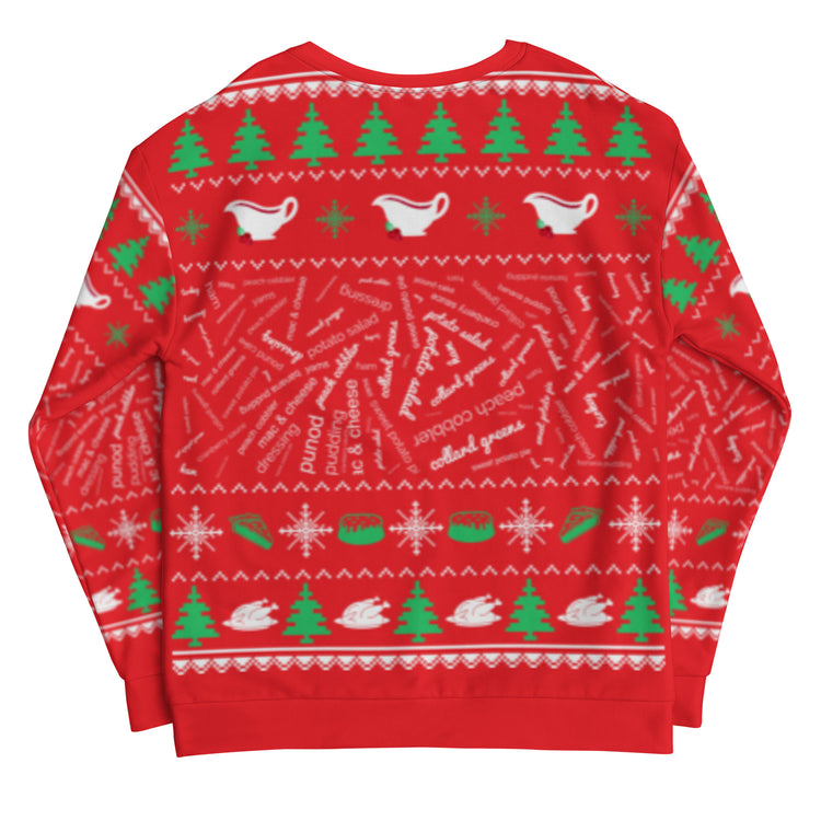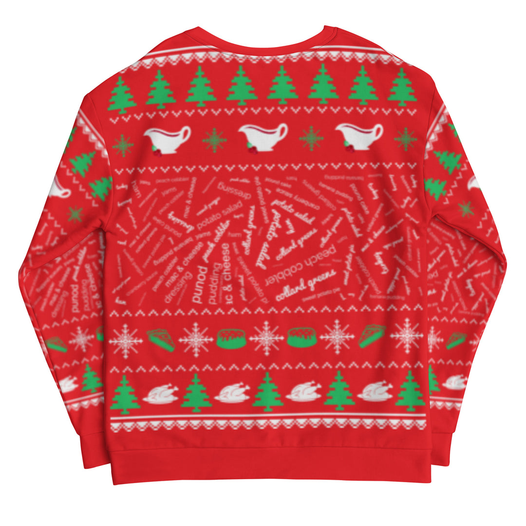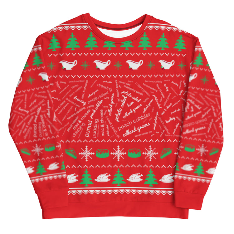 The holidays are upon us. That means it's ugly sweater season, but most importantly, that means GOOD FOOD! This ugly Christmas sweatshirt is ALL ABOUT THE FOOD. It lists some of your favorite holiday meal staples: turkey, dressing, ham, mac & cheese, collard greens, sweet potato pie, peach cobbler... You Name It!