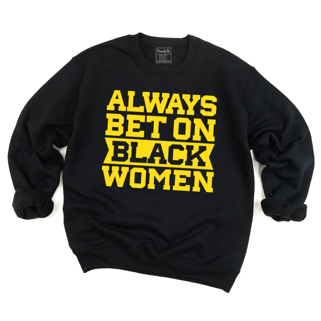 Always Bet on BLACK WOMEN! PERIODT! Make a statement with this sweatshirt. It comes in yellow letters.