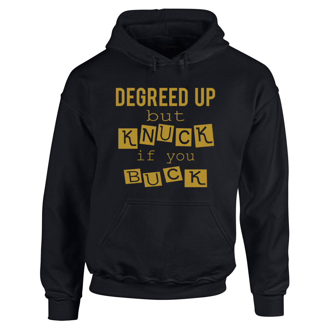 Degreed up, but KNUCK if you BUCK. You know what I'm talking about. You have folks who want to test you, because they forgot you're from the hood and you grew up on Knuck if You Buck. Little do they know, you've got degrees, but you've still got them hands, too. Let them know with this hoodie.