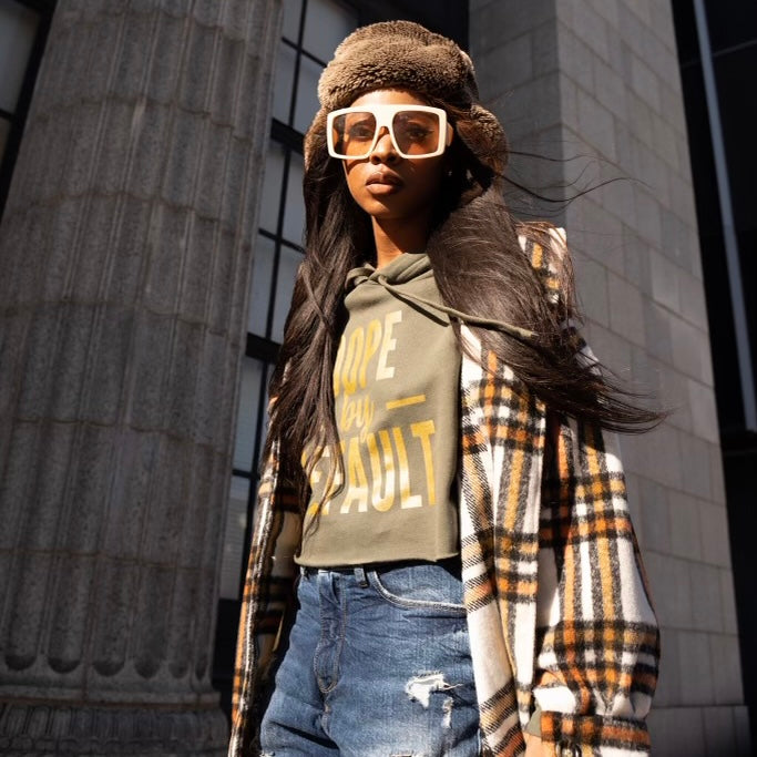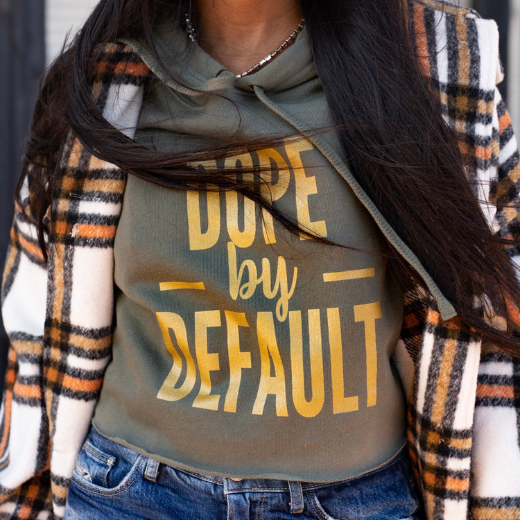 When you wake up, and your dopeness is automatically turned on, you're Dope by Default! Let 'em know, with this super cute military green and metallic gold (shimmer), or black and metallic gold (shimmer) cropped hoodie.