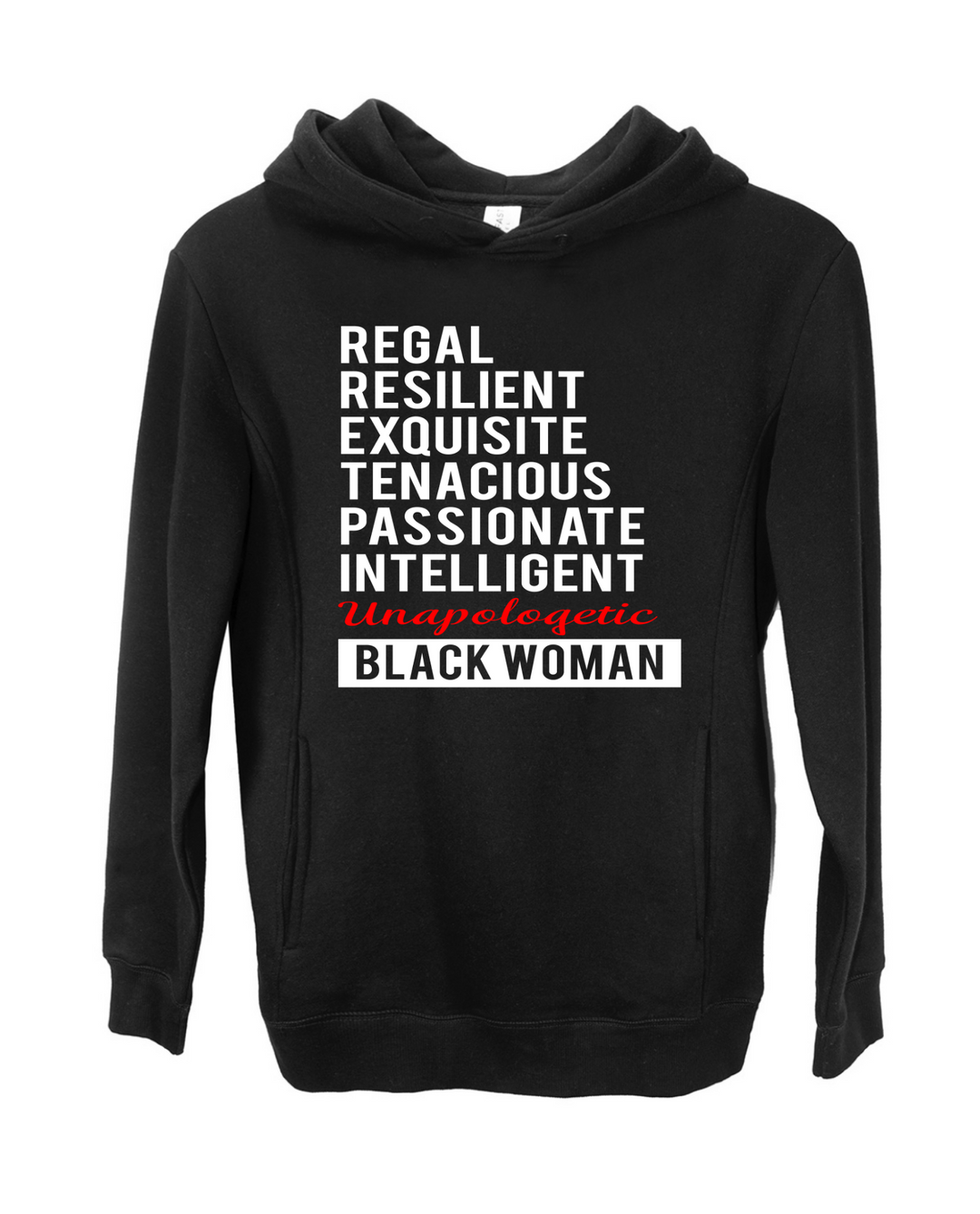 Our Traits of a Black Woman hoodie celebrates the strength, resilience, and beauty of Black women. This hoodie features the words "Regal, Resilient, Exquisite, Tenacious, Passionate, Intelligent, Unapologetic Black Woman," to describe the unique and powerful qualities that Black women possess.