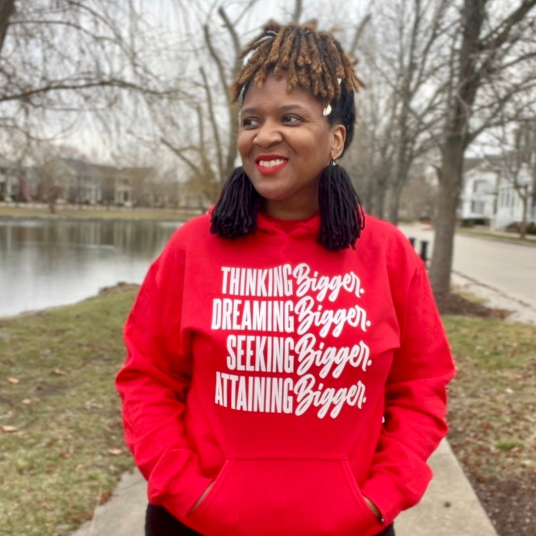 This red hoodie is a stylish way to express a powerful message! The bold white words on the front of the hoodie read: "Thinking Bigger, Dreaming Bigger, Seeking Bigger, Attaining Bigger." It’s the perfect reminder to think big and strive for success.