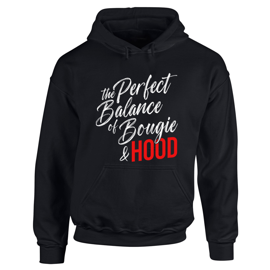 Looking for a statement that PERFECTLY captures your personality? We gotchou! This hoodie is the perfect choice for women who consider themselves to be a hybrid of bougie and hood. The black hoodie features eye-catching white letters, with the word "HOOD" being highlighted in bold red for emphasis. Even the design itself is giving bougie and hood!